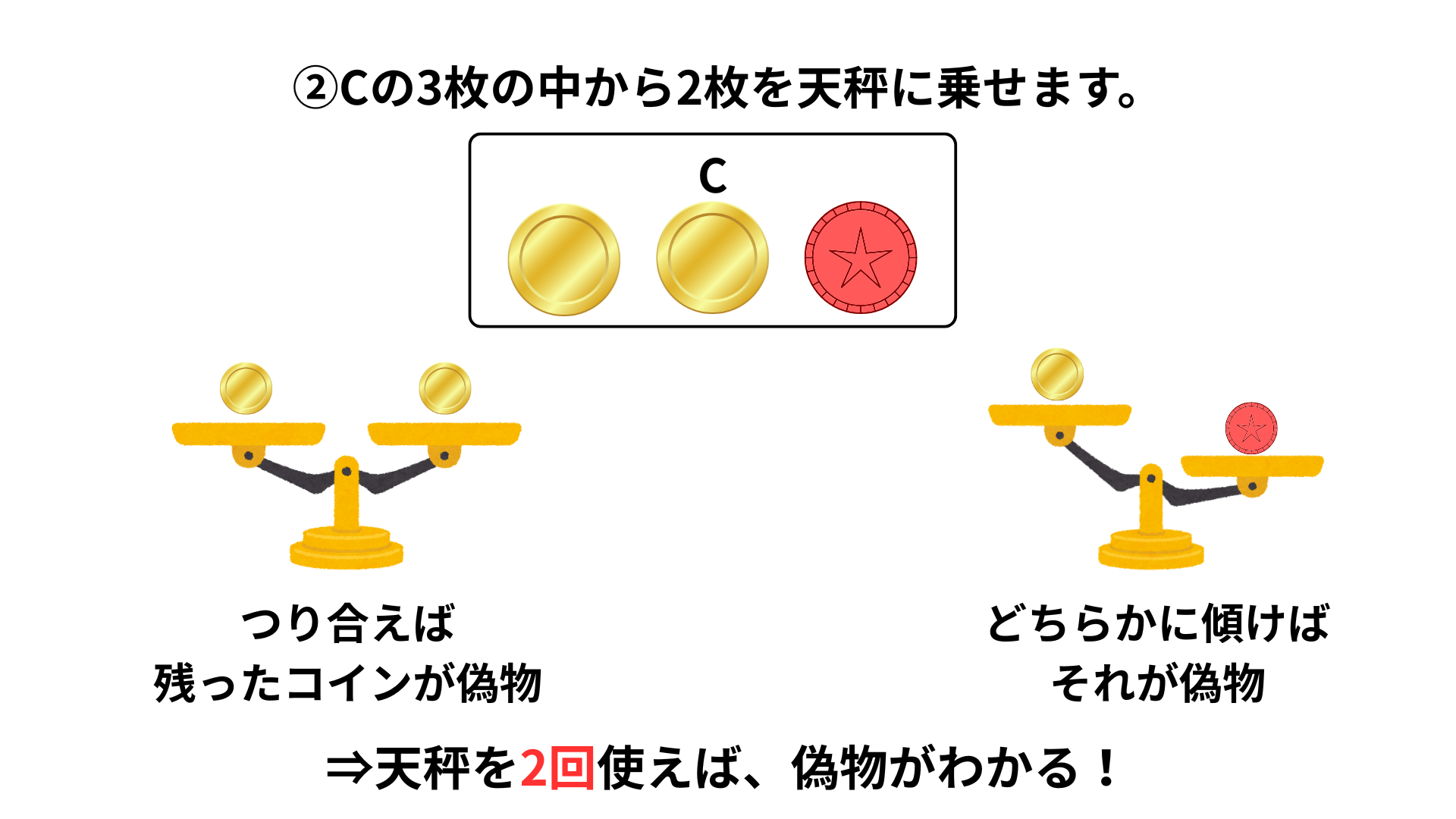 どちらの場合でも、重さの違うコインが含まれているのは C のグループだと分かります。