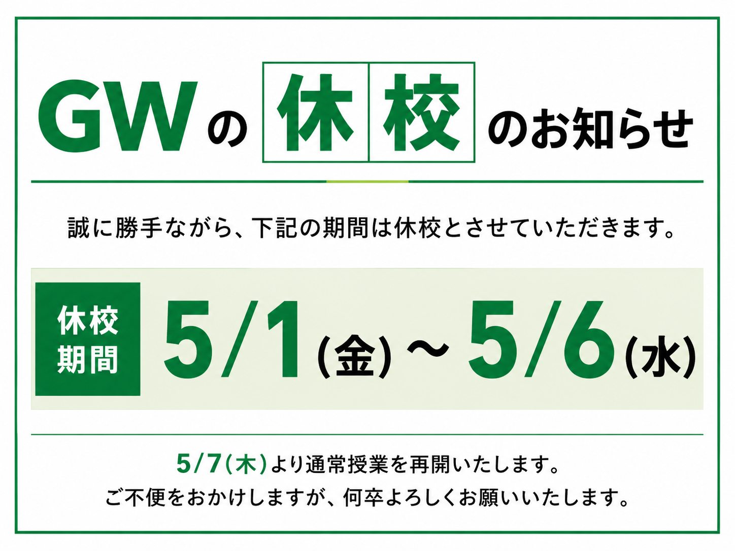 誠に勝手ながら、下記の期間はゴールデンウィーク休校とさせていただきます。